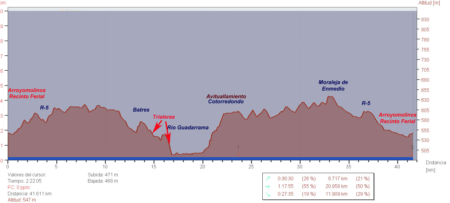 Recorridos: 2011 1.-42 km. Es un recorrido exigente a nivel físico y técnico con tramos de roderas, uno en la bajada de Batres al río Guadarrama y una subida de 2 km muy técnica desde el río Guadarrama hasta Cotorredondo. Se sale del Recinto Ferial de Arroyomolinos en marcha neutralizada hasta la parte alta del municipio para cruzar por un túnel la autopista de peaje R-5, por el camino de Moraleja en dirección a Humanes, se gira a la derecha para tomar el camino de Batres, se atraviesa por debajo del puente la carretera de Grinón-Navalcarnero, se atraviesa neutralizados y por el carril derecho el casco urbano de Batres para tomar el camino de descenso hasta el río Guadarrama: ¡¡¡ Atención en este descenso que está lleno de roderas y zonas técnicas donde hay que circular de uno en uno y con 2 metros de distancia, como mínimo, del ciclista de alante!!! Volvemos a atravesar por debajo de un puente la carretera de Navalcarnero-Griñón, continuamos, por una senda preciosa, en paralelo al Guadarrama para subir hasta Cotorredondo por una senda de 30 centímetros cuesta arriba con alguna rampa del 20%. Arriba, en Cotorredondo, está ubicado el avituallamiento. Después se continúa en descenso en dirección a Humanes, se gira a la izquierda en dirección Moraleja de Enmedio, donde nos reagrupamos de nuevo para cruzar 500 metros por una parte urbanizada de Moraleja de Enmedio y seguir en descenso ¡¡¡con muchos tramos de arena suelta donde la bici se va donde quiere!!. Se cruza de nuevo la R-5, hasta el arroyo y se gira a la izquierda por la Vía Pecuaria de Móstoles-Arroyomolinos para tomar el carril bici que nos deja al lado del recinto Ferial. |