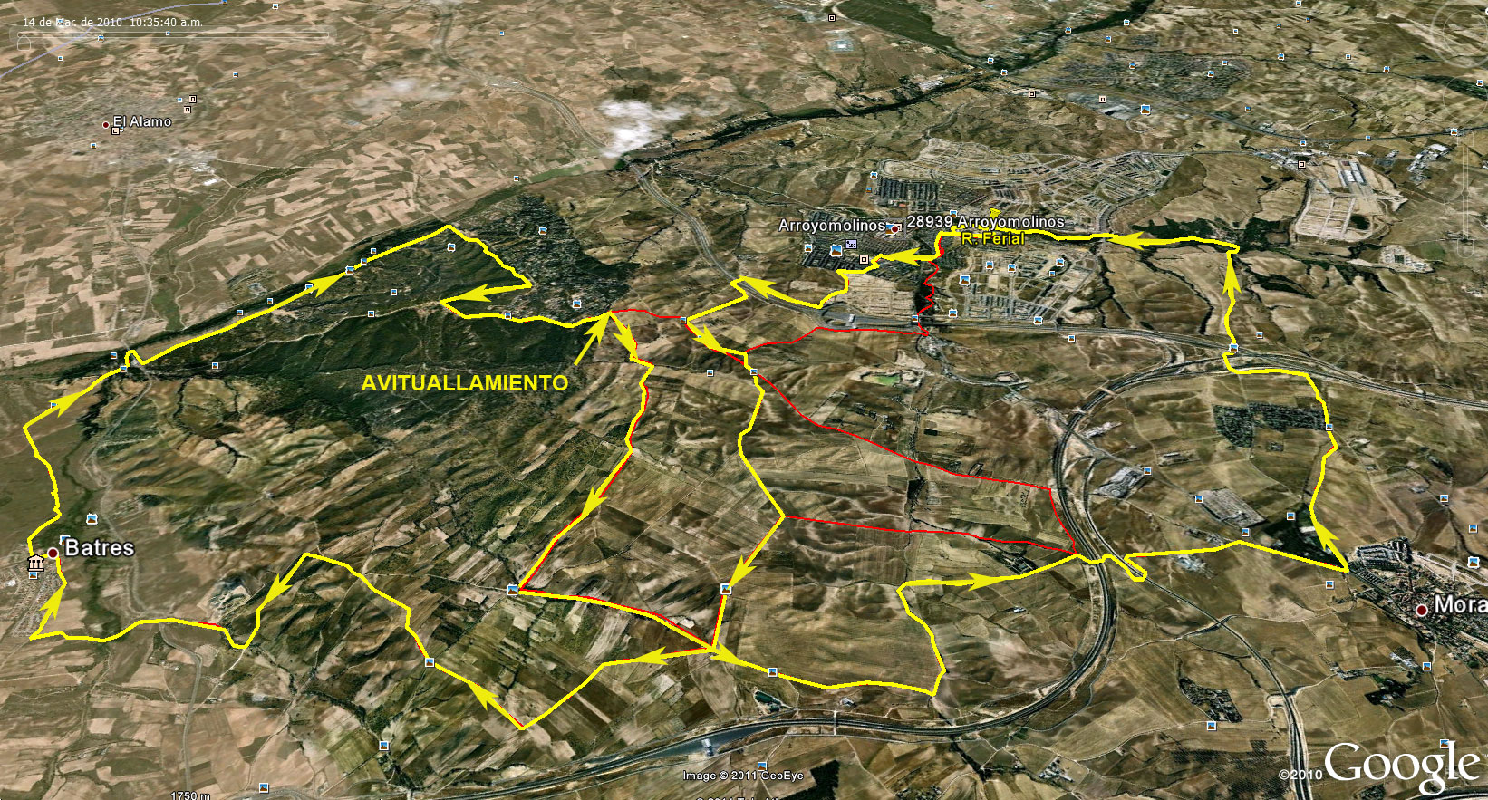 2.-27 km. Recorrido de Nivel medio sin complicaciones técnicas, salvo tramos de arena suelta. Se sale del Recinto Ferial de Arroyomolinos en marcha neutralizada hasta la parte alta del municipio para cruzar por un túnel la autopista de peaje R-5 en dirección a Humanes, se hace un bucle para tomar dirección Cotorredondo, donde está ubicado el avituallamiento. Después se continúa en descenso en dirección a Humanes, se gira a la izquierda en dirección Moraleja de Enmedio, donde nos reagrupamos de nuevo para cruzar 500 metros por una parte urbanizada de Moraleja de Enmedio y seguir en descenso ¡¡¡con muchos tramos de arena suelta donde la bici se va donde quiere!!. Se cruza de nuevo la R-5, hasta el arroyo y se gira a la izquierda por la Vía Pecuaria de Móstoles-Arroyomolinos para tomar el carril bici que nos deja al lado del recinto Ferial. 3.- 10 km. Para niños Por la Vía Pecuaria de Móstoles-Arroyomolinos y la zonas de carril bici |