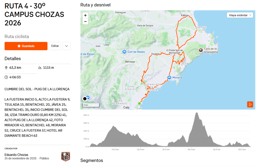 RUTA 4 – CUMBRE DEL SOL (PUIG DE LA LLORENÇA) RUTA 4 – 30º CAMPUS CHOZAS 2026 | Ruta ciclista de 63,3 km en Strava