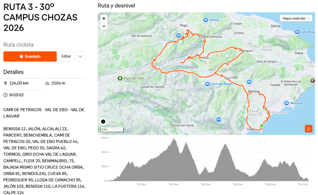 RUTA 3 – RUTA 3 – 30º CAMPUS CHOZAS 2026 | Ruta ciclista de 124,0 km en Strava