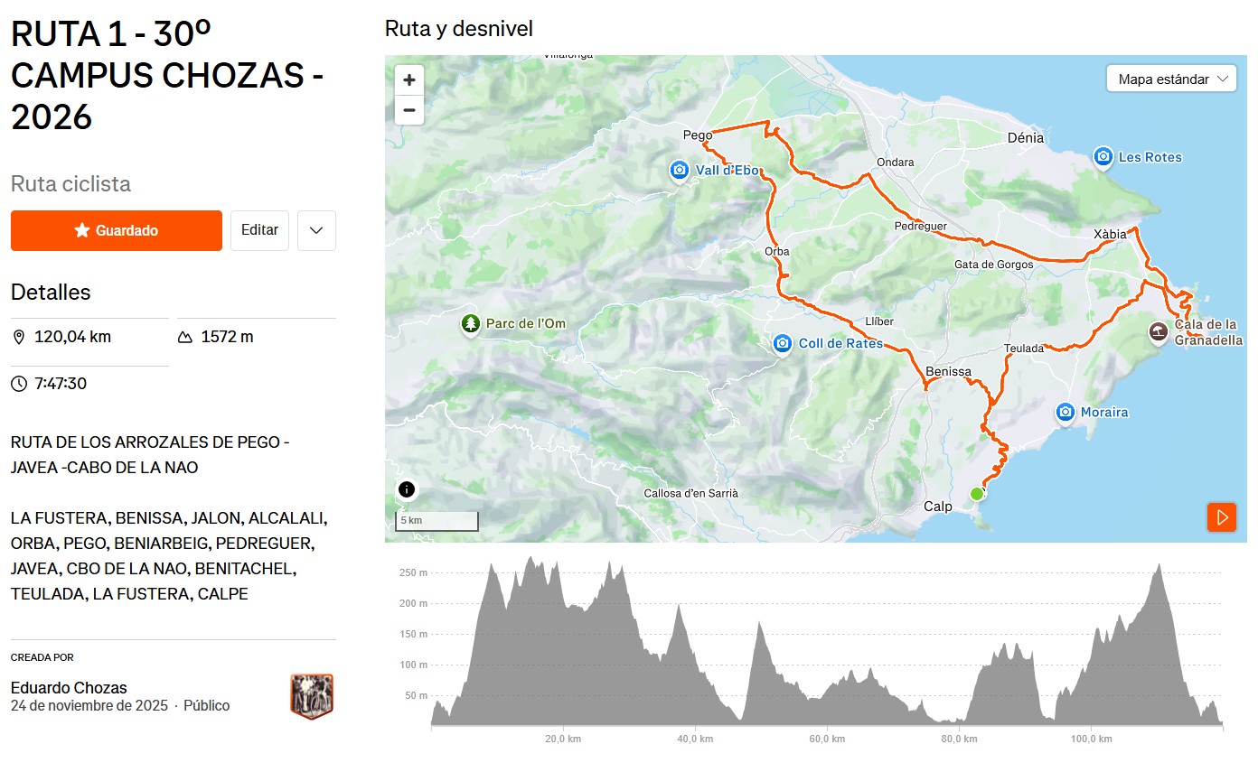 RUTA 1: RUTA 1 – 30º CAMPUS CHOZAS – 2026 | Ruta ciclista de 120,0 km en Strava